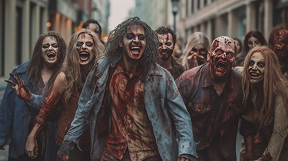 The guests are late, the grid is on the fritz, and sirens blast out dire warnings of impending doom as recently deceased corpses rise from the grave as UNDEAD CANNIBALS, devouring humans and spreading the ZOMBIE VIRUS. The desperate survivors band together in the flux of what’s real and unreal, fighting for their lives against the undead, against the machines, and against each other. This aggressive black comedy explores the Great Replacement Theory to its logical, self-destructive ends.