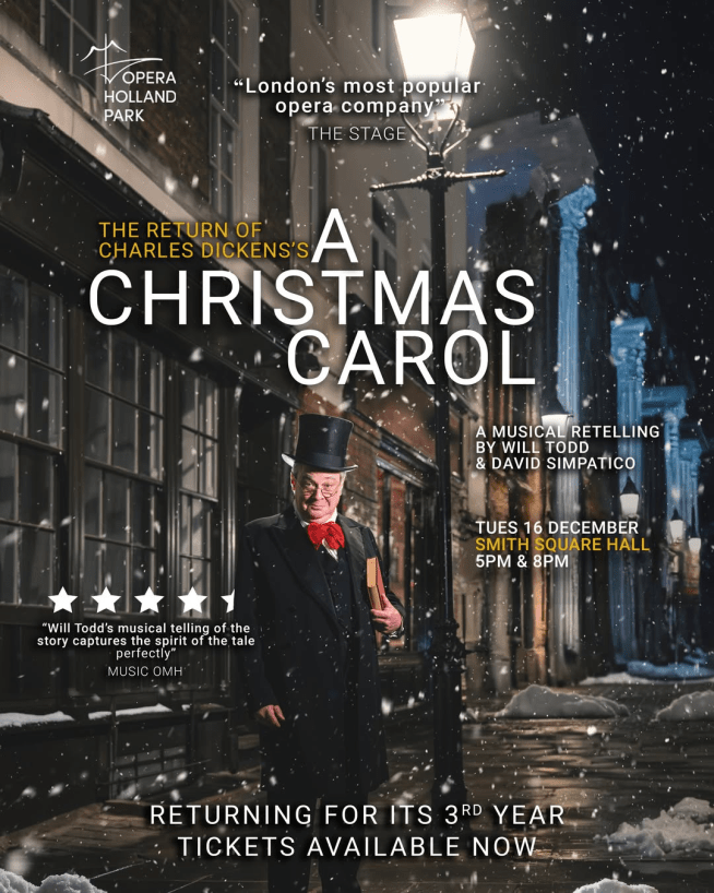 Produced by James Clutton and Opera Holland Park, directed by Martin Duncan, December 2024. Cast and Musicians: Kit Benjamin: Narrator and Scrooge Alys Roberts: Fan and Tiny Tim Fleur de Bray: Belle and Laundress Victoria Simmonds: Ghost of Christmas Past and Char Woman Charlotte Badham: Ghost of Christmas Present and Charity Collector 2 Charne Rochford: Bob Cratchit Julien Van Mellaerts: Mr Fezziwig and Charity Collector 1 Paul Carey Jones: Fred and Undertaker’s Man Robert Winslade Anderson: Jacob Marley’s Ghost and Joe, the Beetle Fran Hills: Piano Dave Ayre: Double Bass Ilona Suomalainen: Accordion