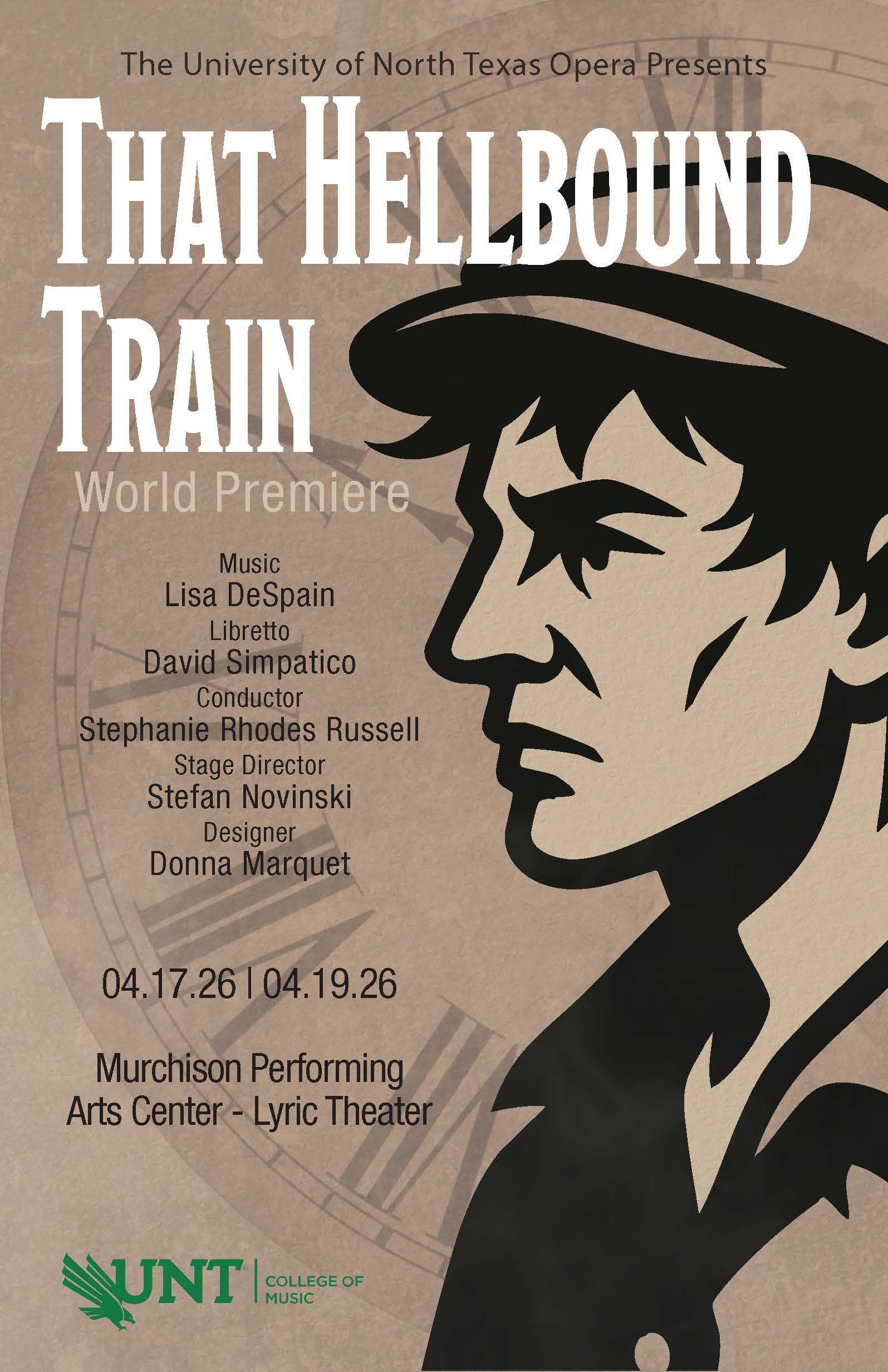 UNIVERSITY OF NORTH TEXAS full student production world premiere, conducted by Stephanie Rhodes Russell, directed by Stefan Novinski, designed by Donna Marquet. Amazing cast of student singing actors knocking it out.